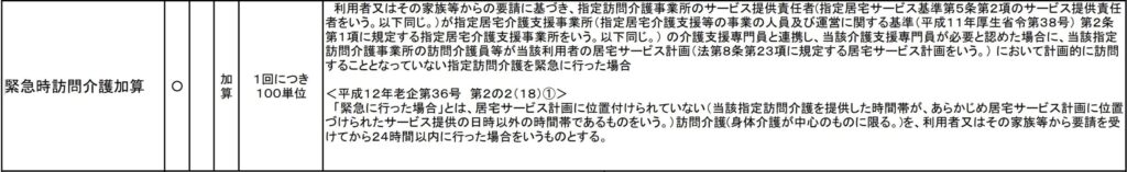 緊急時訪問介護加算は「1回につき100単位」の加算です(厚生労働省「訪問介護費(要件一覧)」)。請求上のサービスコードは、WAM NETのサービスコード表でも確認できます(WAM NET「介護給付費単位数等サービスコード表」)。